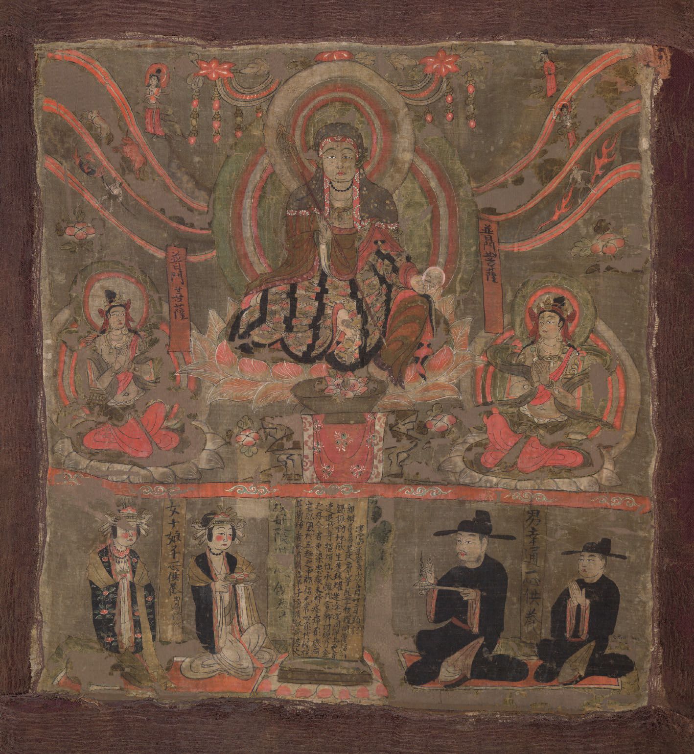 《地藏菩薩圖》繪制于北宋建隆四年(公元963年)。圖中地藏菩薩半跏趺坐于蓮臺上,左手托如意寶珠,右手拈持錫杖。菩薩兩旁,各放射出三條光帶,分別代表六道,體現(xiàn)出地藏菩薩的“無量功德”與“慈悲大愿”,也揭示了當(dāng)時民眾寄希望于宗教信仰、虔誠渴盼救贖的殷切心愿。