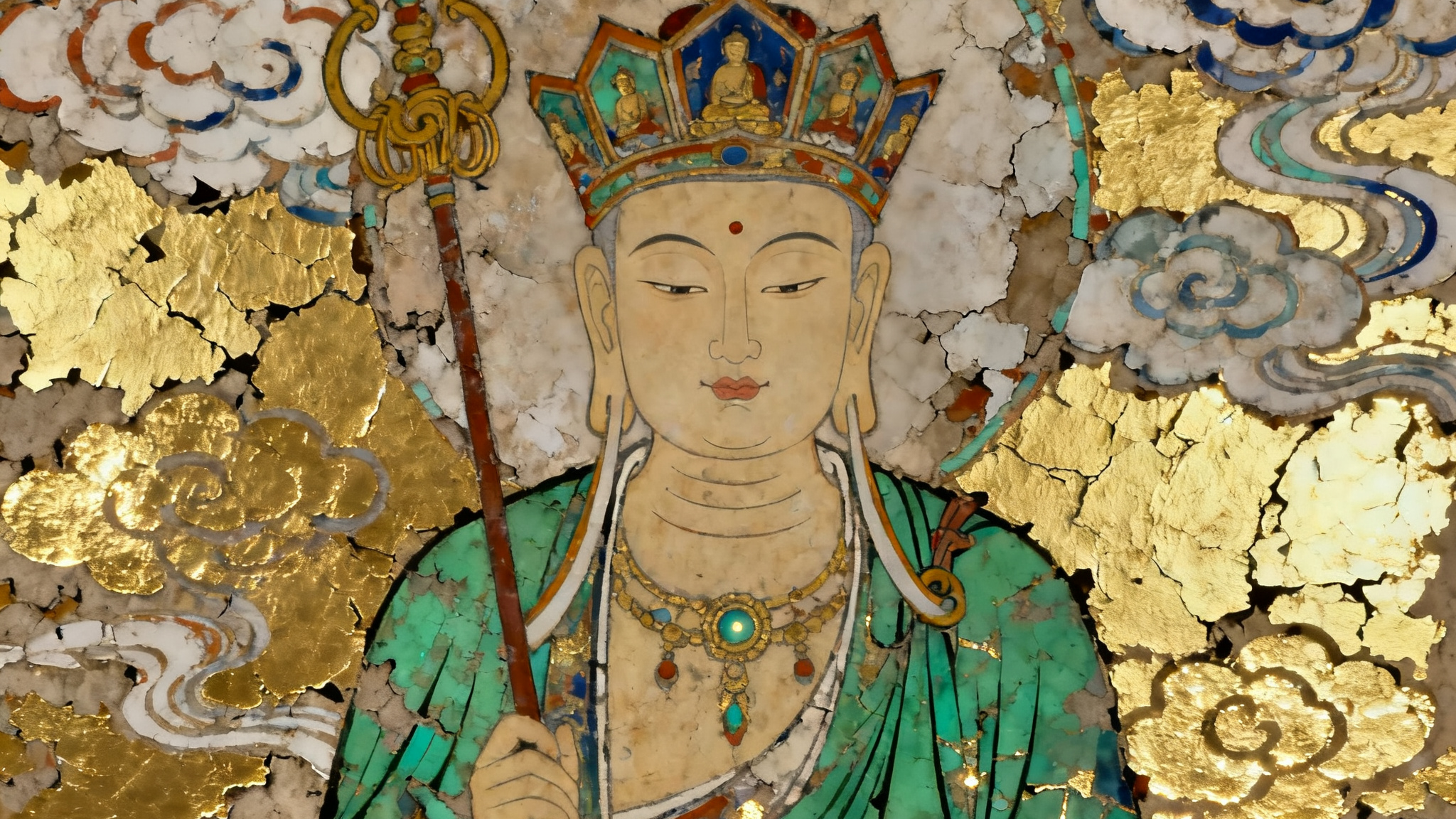 菩薩的服飾描繪得極為精細(xì)。飄逸的衣袂線條流暢,仿佛被無形的微風(fēng)輕輕拂動,展現(xiàn)出一種靈動的美感。衣紋的褶皺處,畫家以細(xì)膩的筆觸勾勒出光影的變化,使得服飾看起來質(zhì)感十足,仿佛觸手可及。而服飾上的圖案和裝飾,更是精美絕倫,色彩鮮艷卻不失莊重,每一處細(xì)節(jié)都彰顯著藝術(shù)家的高超技藝和對宗教題材的虔誠態(tài)度。