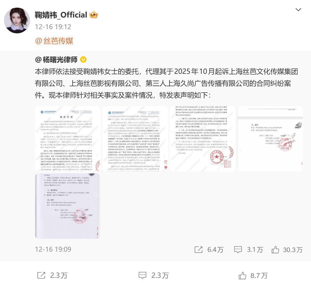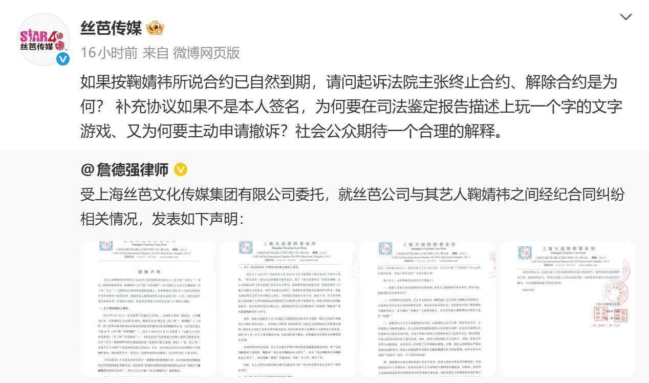 從合約到期時間的爭執到收入分配的拉扯,再到簽名真偽的鑒定爭議。近日,絲芭與鞠婧祎這場“解約大戲”不斷拋出新話題,霸占各大熱搜榜單,儼然已經上升為一場“輿論戰”,雙方各執一詞的隔空喊話,讓網友眼花繚亂。