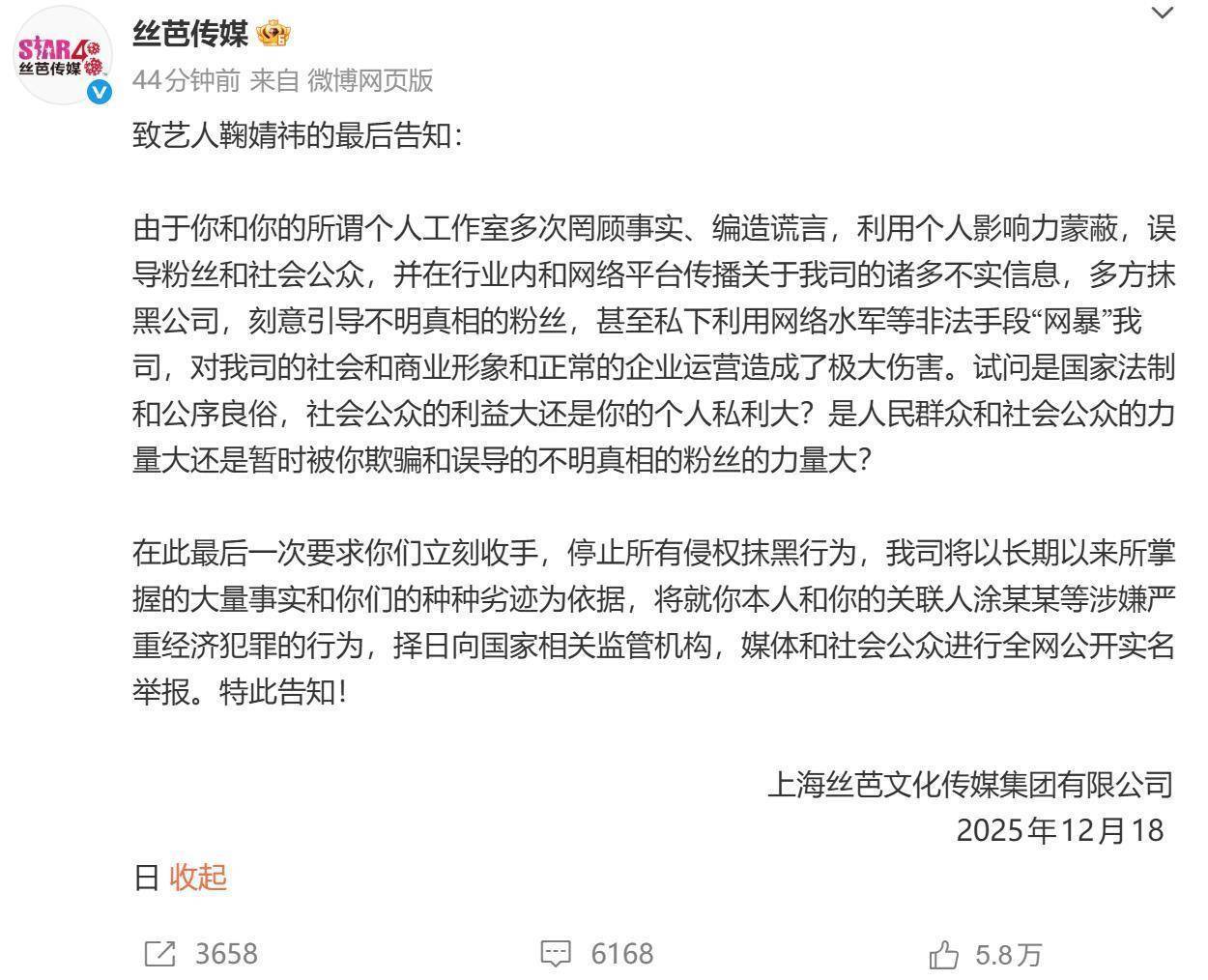12月18日,絲芭傳媒發布“致藝人鞠婧祎的最后告知”,文中提到,在此最后一次要求你們立刻收手,停止所有侵權抹黑行為,我司將以長期以來所掌握的大量事實和你們的種種劣跡為依據,將就你本人和你的關聯人涂某某等涉嫌嚴重經濟犯罪的行為,擇日向國家相關監管機構,媒體和社會公眾進行全網公開實名舉報。特此告知。