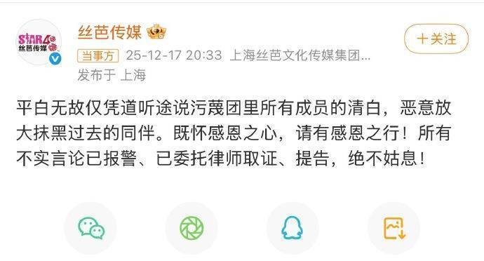 當日,絲芭傳媒發文回應稱曾艷芬是“平白無故僅憑道聽途說污蔑團里所有成員的清白,惡意放大抹黑過去的同伴”,表示所有不實言論已報警、已委托律師取證、提告。