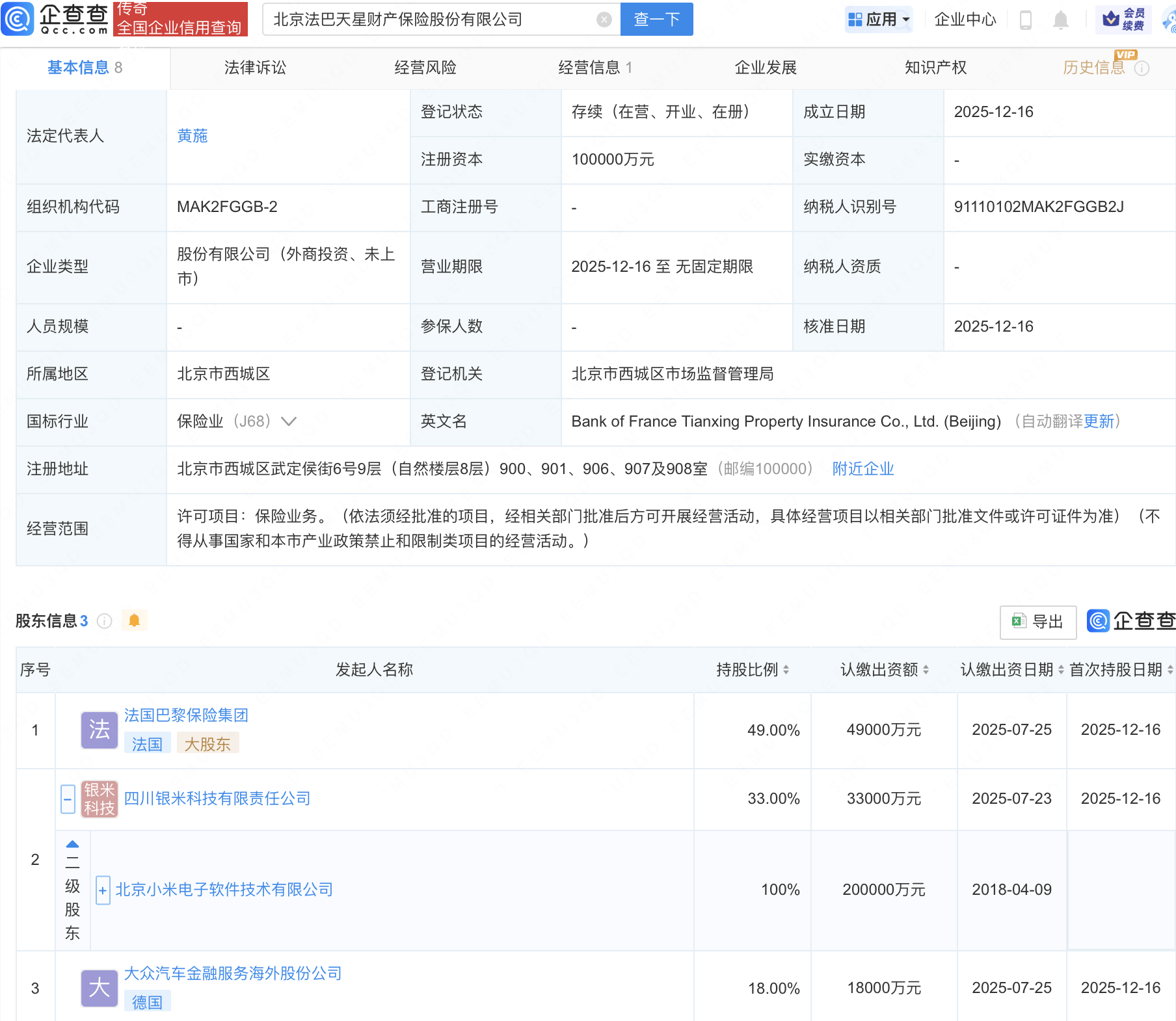 企查查APP顯示,近日,北京法巴天星財產保險股份有限公司成立,注冊資本10億元,經營范圍為保險業務。企查查股權穿透顯示,該公司由法國巴黎保險集團、北京小米電子軟件技術有限公司全資子公司四川銀米科技有限責任公司、大眾汽車金融服務海外股份公司共同持股。
