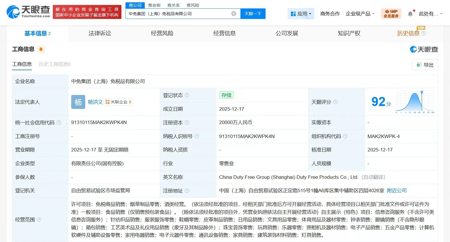 中免集團(上海)免稅品有限公司成立,注冊資本2億