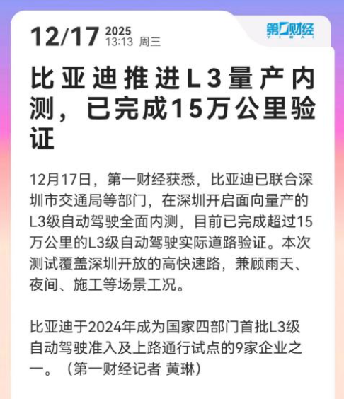“車市小喇叭”近日獲悉,比亞迪已聯合深圳市交通局等部門,在深圳開啟面向量產的L3級自動駕駛全面內測,目前已完成超過15萬公里的L3級自動駕駛實際道路驗證。本次測試以安全為核心,覆蓋深圳開放的高快速路,兼顧雨天、夜間、施工等不同場景工況。全面驗證L3級別產成熟度和可靠性,為國家L3級自動駕駛落地提供實踐依據。