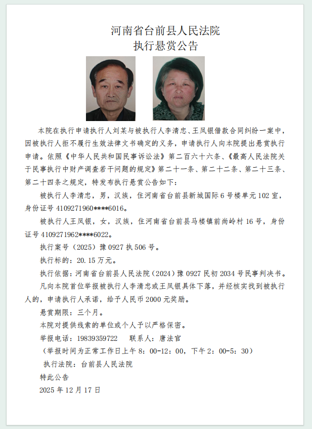 為切實保護債權人的合法權益,打擊被執行人規避執行行為,加強社會信用機制建設,依據《最高人民法院關于民事執行中財產調查若干問題的規定》第二十二條之規定,本院依申請執行人申請,決定發布執行懸賞公告,對公告案件的被執行人下落和財產線索提供者予以獎勵。
