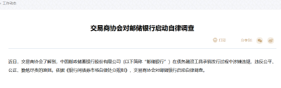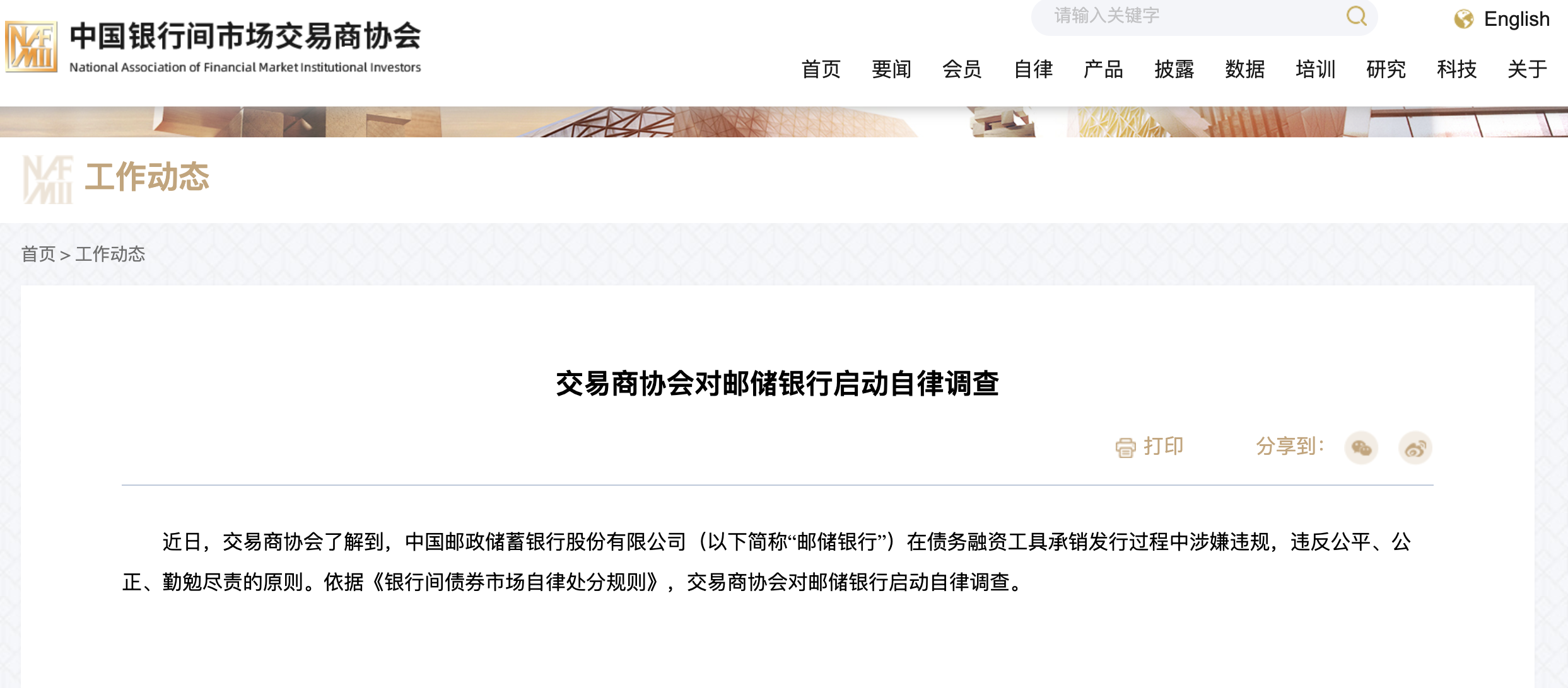 12月15日,銀行間市場(chǎng)交易商協(xié)會(huì)一則公告引發(fā)關(guān)注:因在債務(wù)融資工具承銷發(fā)行中涉嫌違反公平、公正、勤勉盡責(zé)原則,郵儲(chǔ)銀行被正式啟動(dòng)自律調(diào)查。