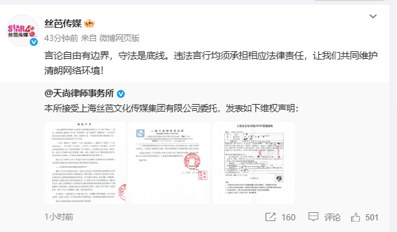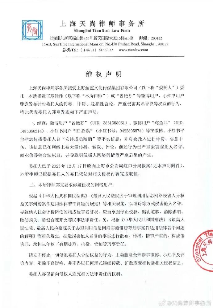 12月18日,絲芭傳媒發文:言論自由有邊界,守法是底線。違法言行均須承擔相應法律責任,讓我們共同維護清朗網絡環境!委托律所天尚律師事務所就曾艷芬近日發表言論發布維權聲明,同時曬相關報警回執單。