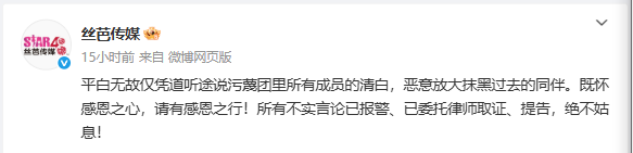 記者注意到,絲芭還發文:平白無故僅憑道聽途說污蔑團里所有成員的清白,惡意放大抹黑過去的同伴。既懷感恩之心,請有感恩之行!所有不實言論已報警、已委托律師取證、提告,絕不姑息!?
