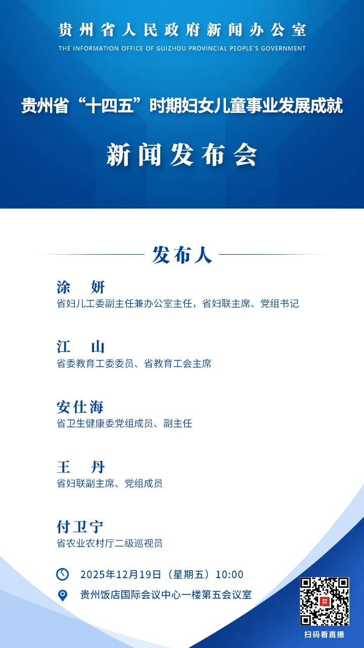 貴州省政府新聞辦將于12月19日10:00在貴州飯店國際會議中心舉行貴州省“十四五”時期婦女兒童事業發展成就新聞發布會。