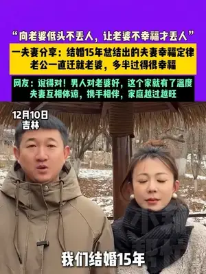 12月10日吉林,“向老婆低頭不丟人,讓老婆不幸福才丟人”一夫妻分享:結(jié)婚15年總結(jié)出的夫妻幸福定律,老公一直遷就老婆,多半過得很幸福,網(wǎng)友:說得對!男人對老婆好,這個家就有了溫度,夫妻互相體諒,攜手相伴,家庭越過越旺(素材:@一只幸運(yùn) )