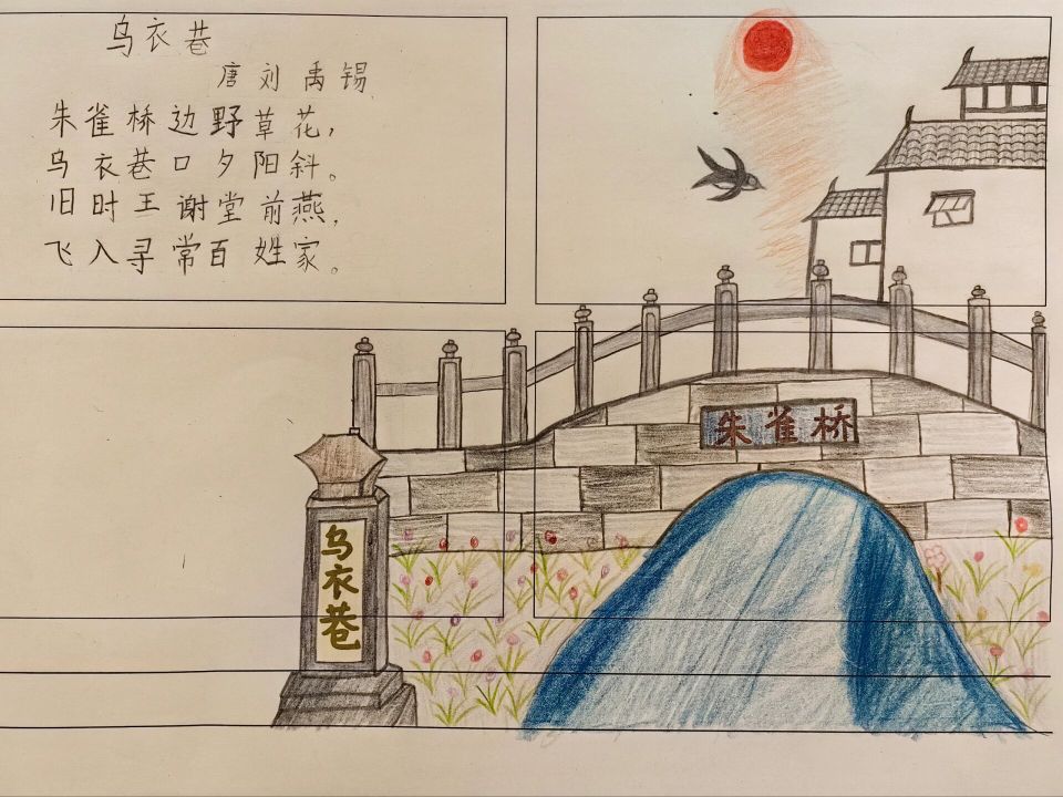 詩的前兩句以精煉的意象對位,完成了從空間到時間的雙重轉換。“朱雀橋”與“烏衣巷”這兩個承載著強烈歷史記憶的地標,與“野草花”、“夕陽斜”這兩種自然物象并置,瞬間將讀者的視線從地理空間引向時間縱深。