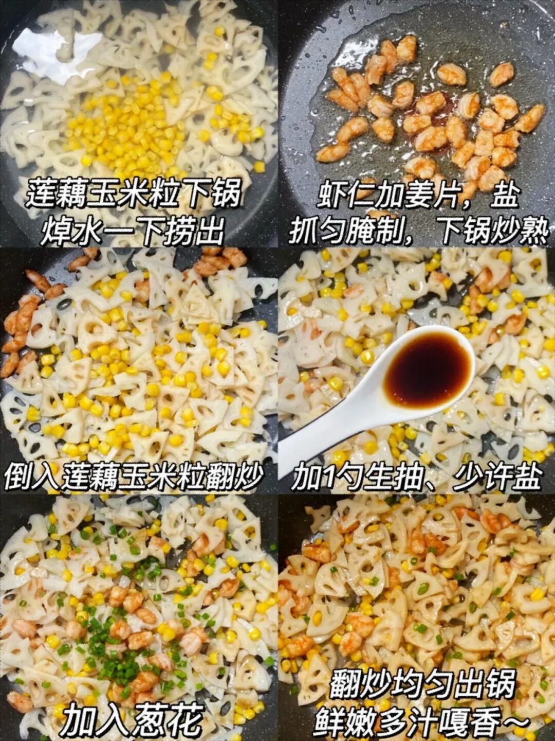 3??、倒入蓮藕、玉米粒翻炒,加1勺生抽,少許鹽,加入蔥花翻炒均勻出鍋,鮮嫩多汁嘎香。