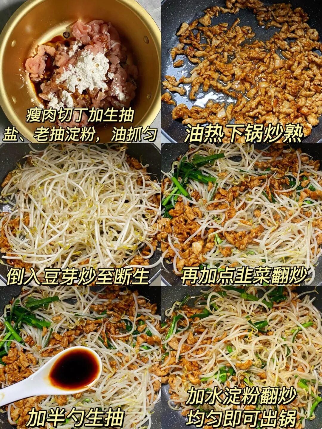 2??、豆芽洗干凈,鍋里油熱下鍋炒熟,倒入豆芽炒至斷生。
