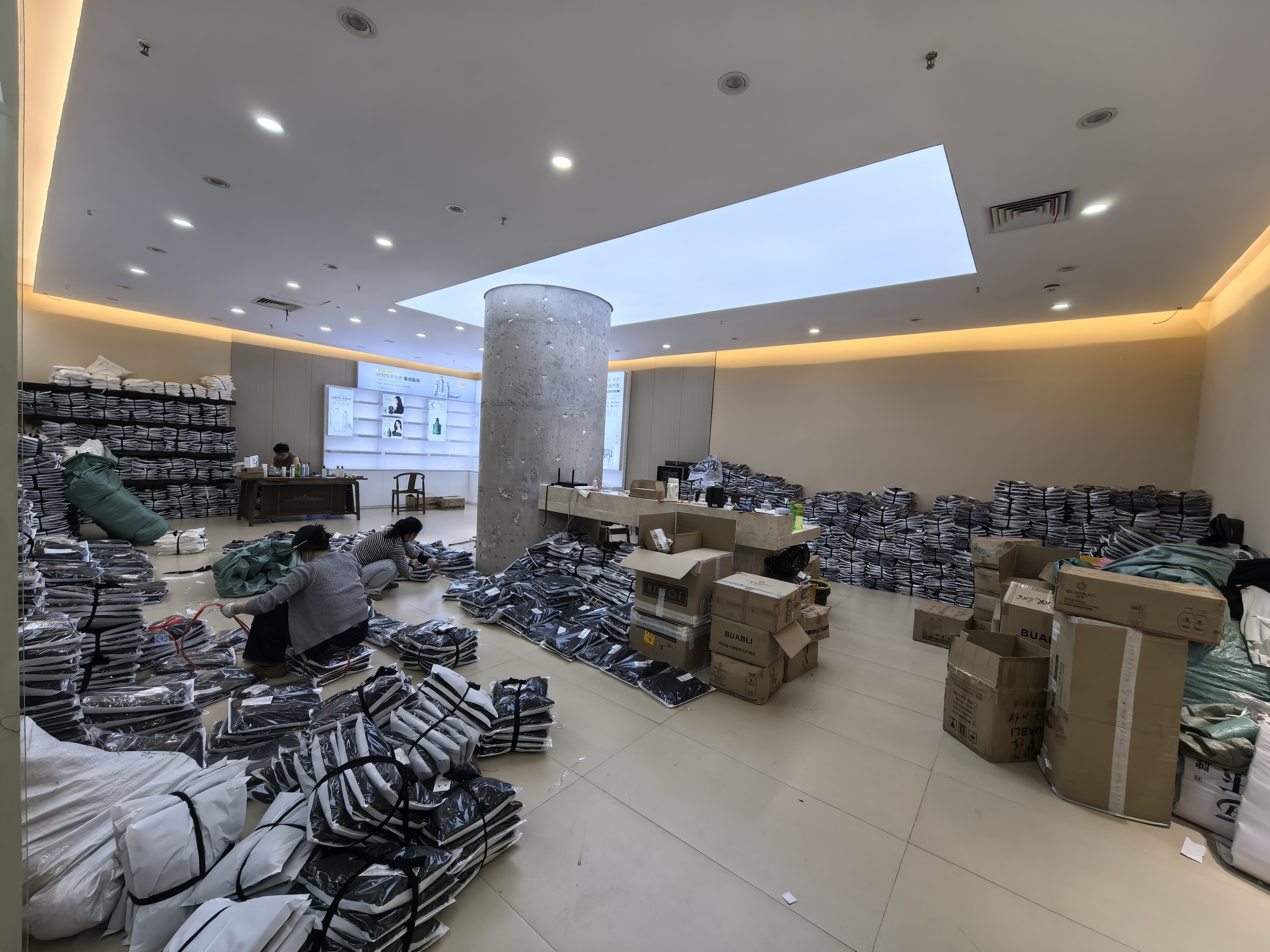 位于火車站商圈的大觀國貿直播基地,是鄭州服裝電商的聚集地。走進李鑫的店里,打包好的女褲在空地堆成齊腰高的小山,幾個工作人員正埋頭封裝,膠帶撕拉的“呲啦”聲此起彼伏。
