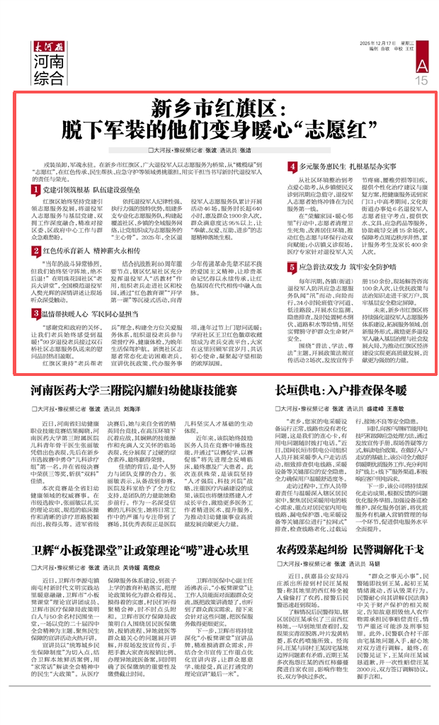 12月17日,大河報刊發(fā)《新鄉(xiāng)市紅旗區(qū):脫下軍裝的他們變身暖心“志愿紅”》。