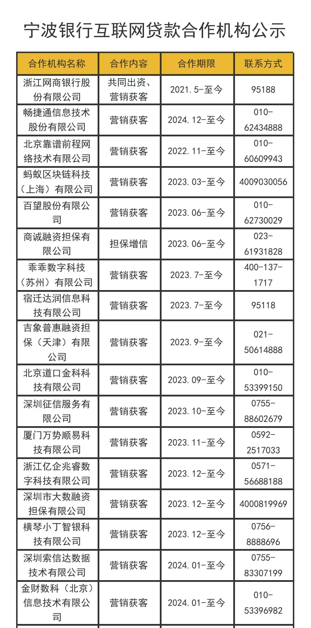 寧波銀行披露的互聯網貸款合作機構名單顯示,該行共與122家機構合作互聯網貸款業務,具體包括:網商銀行、暢捷通、辦公逸、乖乖數科、道口金科、粵財征信、順豐科技、中移金科、吉象普惠(中國太平旗下)、找鋼網、財付通小貸、唯品會、眾安在線、釘釘、愛奇藝、中國銀聯、比亞迪汽車、華為、淘寶閃購、轉轉等。