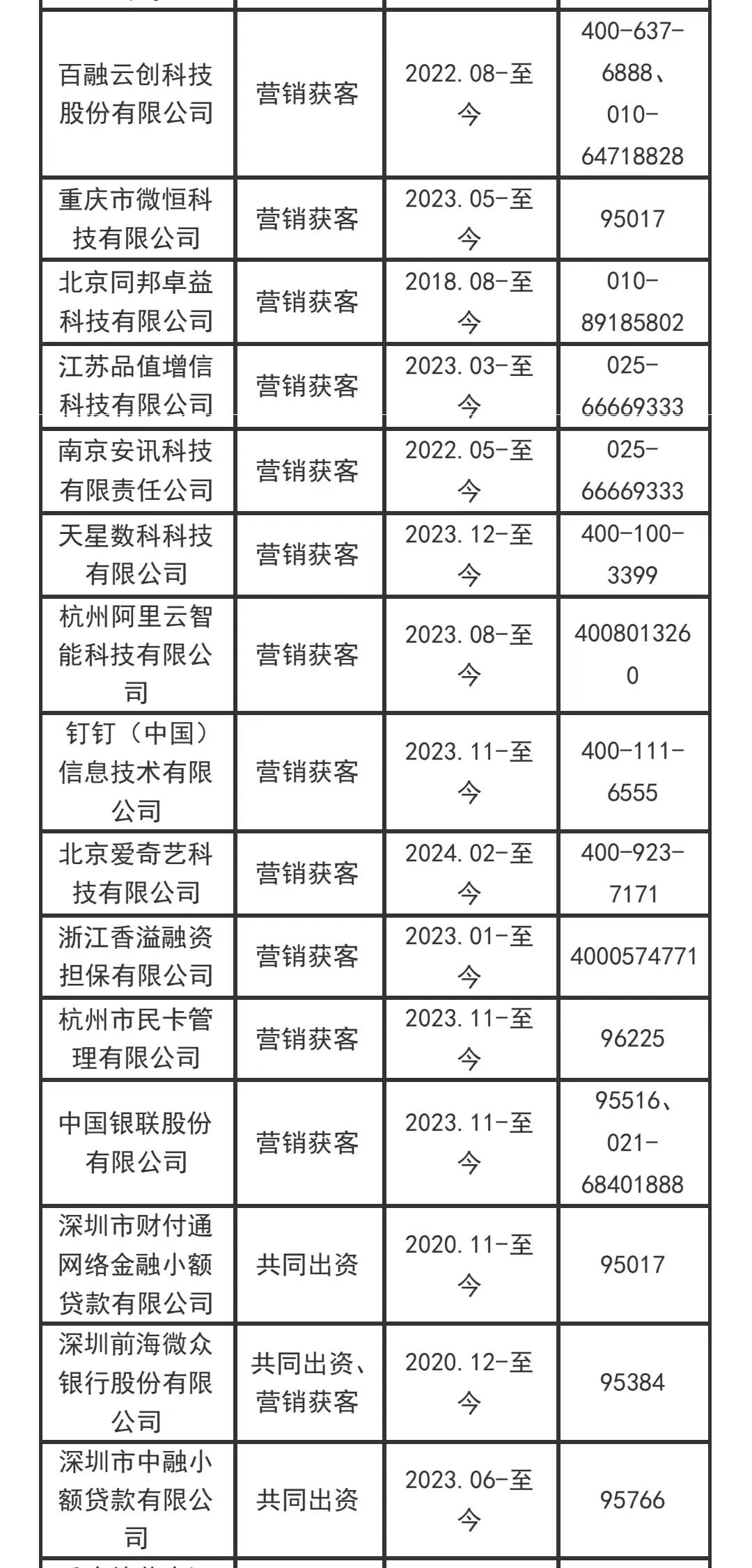 其中,共同出資合作機構9家,分別為:網商銀行、眾邦銀行、螞蟻消金、盛際小貸(京東旗下)、財付通小貸(騰訊旗下)、微眾銀行、中融小貸(字節跳動旗下)、度小滿小貸、三快小貸(美團旗下)。