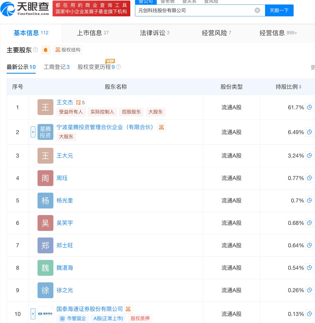 天眼查App信息顯示,元創(chuàng)股份成立于1991年4月,前身為浙江省三門縣膠帶制品廠。目前,該公司的注冊資本為5880萬元,法定代表人為王文杰,主要股東包括王文杰、王大元等。