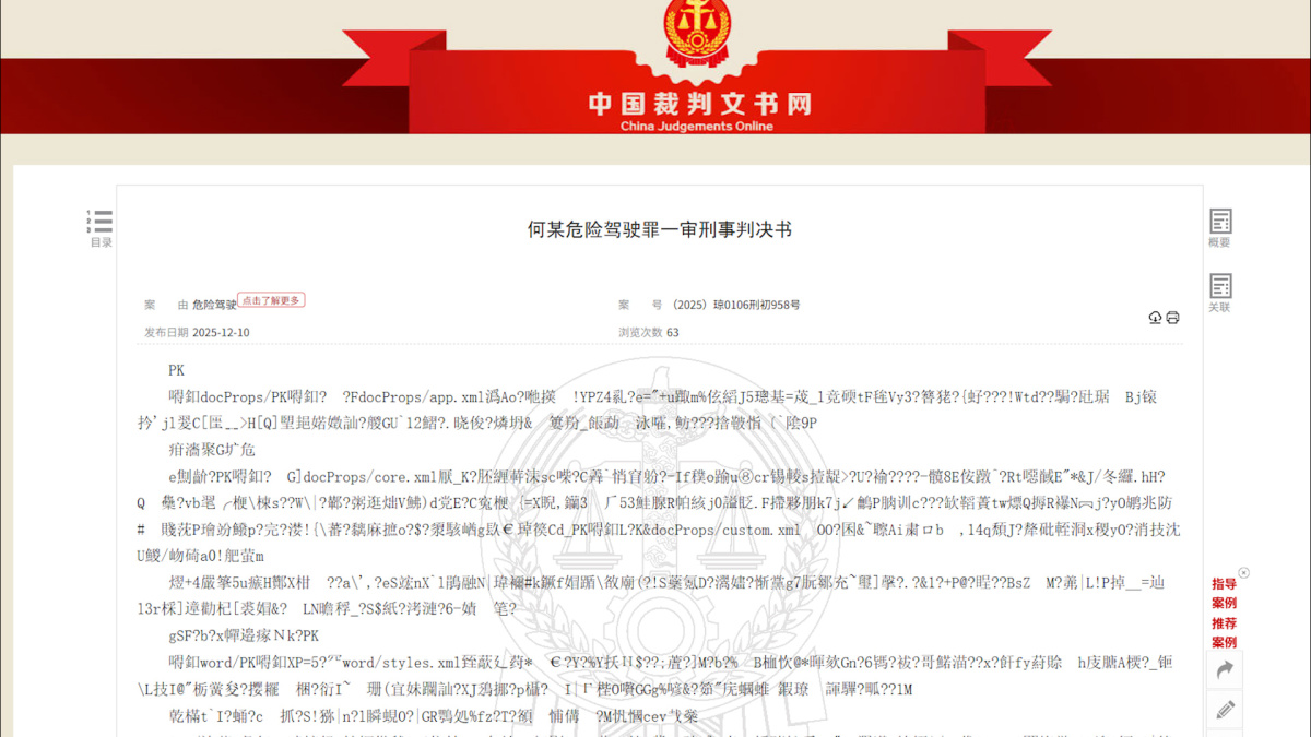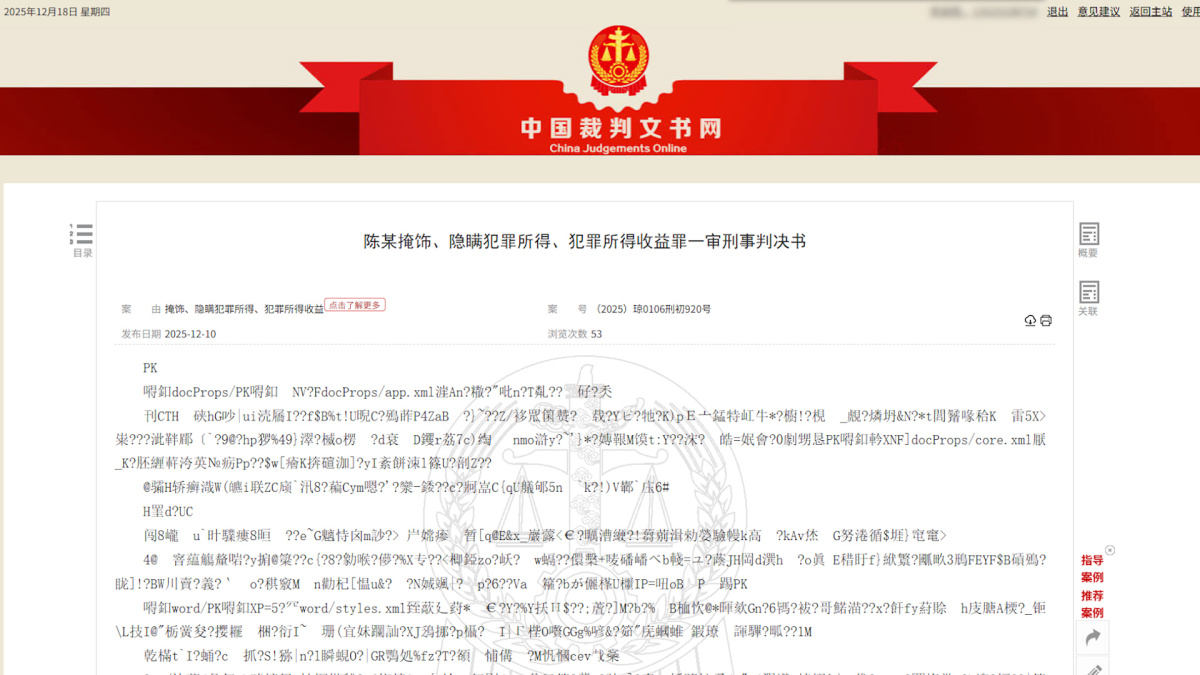 12月18日,大河報《看見》記者在中國裁判文書網查詢發現,海口市龍華區人民法院于2025年12月8日至10日公布的多份判決書,內容均顯示為亂碼。