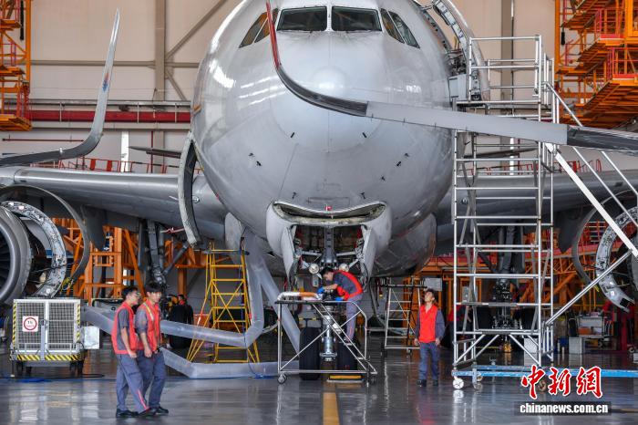 圖為海南自貿(mào)港一站式飛機維修產(chǎn)業(yè)基地里,工程師正為進境維修飛機提供全面檢修服務(wù)。 中新網(wǎng)記者 駱云飛 攝