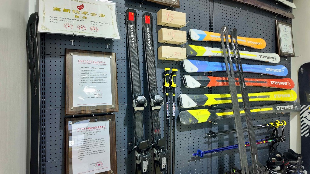 在廠房內,記者看到了多項創新產品:采用“三段指針”式刀刃結構的冰刀鞋,印有哈爾濱市花丁香花及本地景點的文創滑雪板,以及可全年使用的陸地訓練滑雪板等。