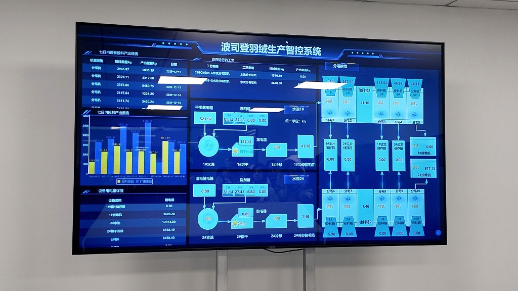 在該公司的智控中心,巨大的顯示屏實時跳動著一組組生產數據。波司登(哈爾濱)科技有限公司總經理王華介紹,這是波司登自主研發的“波司登羽絨生產智控系統”,屏幕上,“七日內設備投料產出詳情”“儲料箱實時數據”等關鍵指標一目了然,實現了生產全流程的數字化監控。