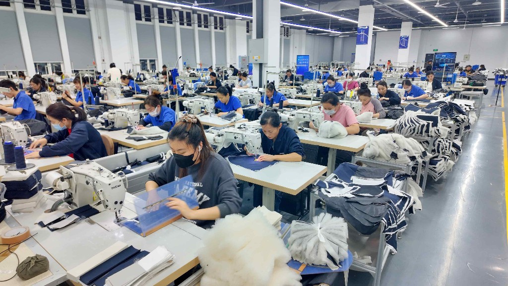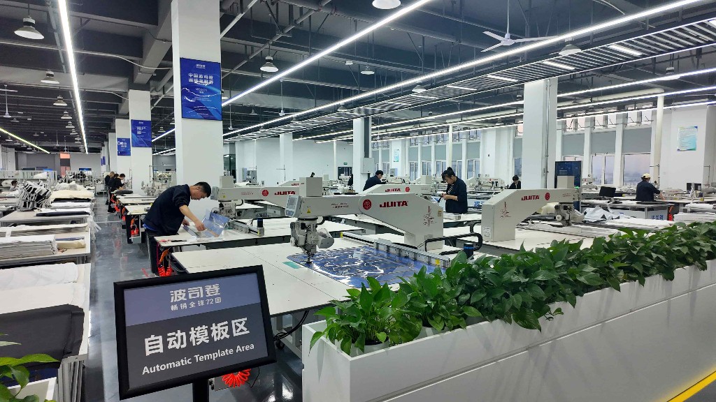 智能化制造不僅體現在原料處理環節,更延伸至成衣制作的全過程。在波司登(哈爾濱)智能制造公司內,6條完整的服裝生產線正滿負荷運轉。