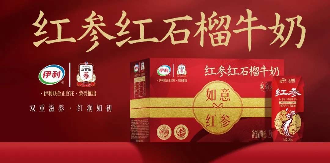其中,伊利x正官莊紅參紅石榴牛奶依托雙巨頭品牌背書,將生牛乳與紅參、紅石榴精粹結合,高端溢價食材搭配大氣喜慶包裝,既賦予禮贈場景的“健康價值”與“體面感”,又通過禮盒規格適配家庭分享與多人饋贈。