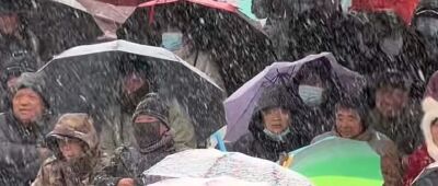 12月12日,河南洛陽市偃師區大口鎮西寨村,大雪紛飛,河南豫劇院青年團的演員仍在專注表演。觀眾撐著傘守在戲臺前——“戲沒停,咱咋能走?”