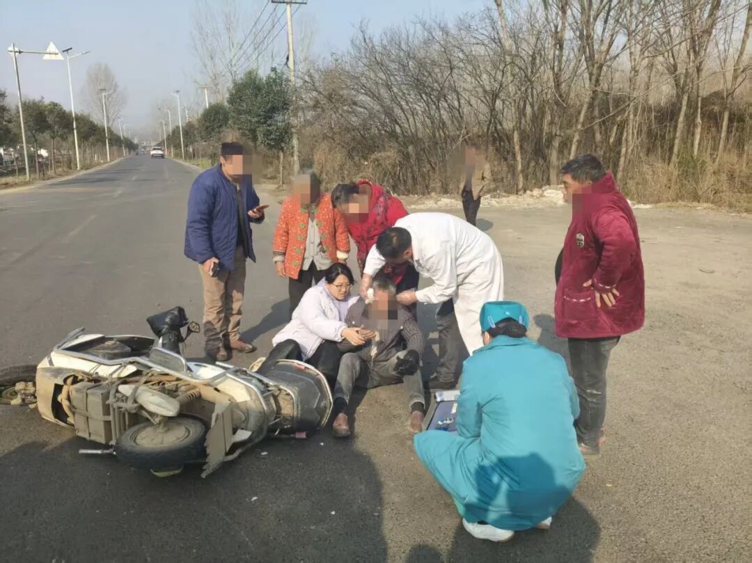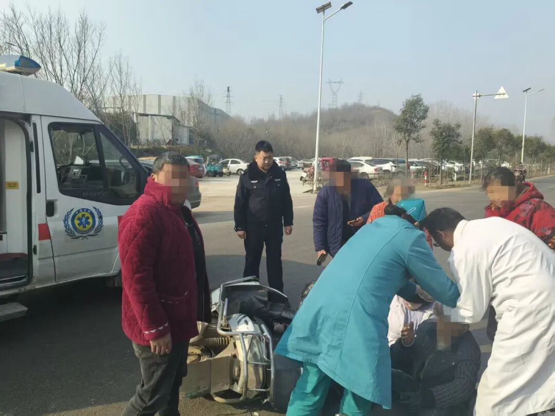 此時,楊莊派出所包村輔警院宗利正在該村開展工作。發現險情后,他立即上前查看人員傷情,并同步通過“警網融合”聯動群,向郜林村村干部告知事故情況,請求支援。郜林村主任曹占宏獲悉后,迅速攜帶應急救援物資趕到現場,與院宗利協同展開處置。二人分工配合,在現場設置警示標識,引導車輛行人繞行,有效防止二次事故發生,同時安撫傷者情緒,并聯系120急救中心。