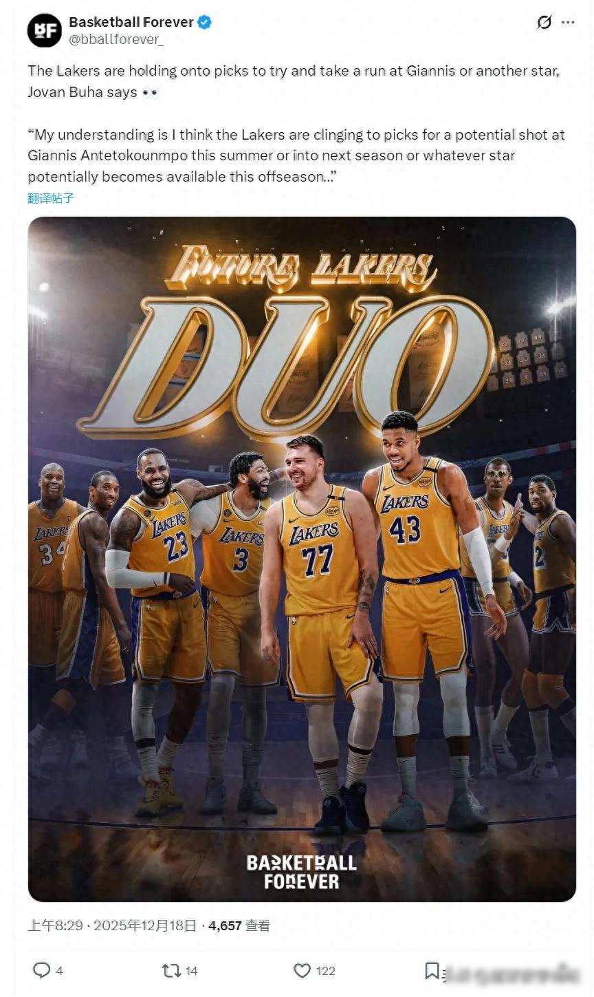 字母哥正在養傷期間,雄鹿隊沒有著急把他交易出去,湖人隊那邊卻已經盯上2026年夏天,打算用大筆薪資空間加上三個首輪簽,再帶上里夫斯去換字母哥,但字母哥目前還沒有表達離隊意愿,雄鹿隊這邊也不著急,他們甚至開始關注拉文和格蘭特,準備為球隊補強陣容,而不是拆散現有隊伍。