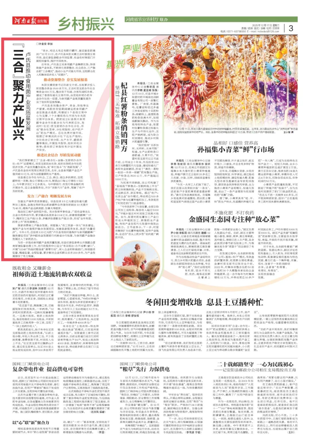12月17日,《河南日?qǐng)?bào)農(nóng)村版》以《“三合”聚力產(chǎn)業(yè)興——盧氏縣推動(dòng)食用菌產(chǎn)業(yè)高質(zhì)量發(fā)展》為題,刊發(fā)報(bào)道了我縣“三合模式”賦能食用菌產(chǎn)業(yè)高質(zhì)量發(fā)展的典型經(jīng)驗(yàn),“清清盧氏”予以轉(zhuǎn)發(fā)。
