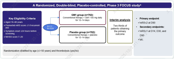 申捷?(單唾液酸四己糖神經節苷脂鈉,GM1)治療急性缺血性卒中(AIS)的隨機、雙盲、安慰劑對照III期研究(FOCUS研究),由南京大學醫學院附屬鼓樓醫院徐運教授牽頭,在全國68家中心開展。該研究納入1232例受試者。其嚴謹的設計、充足的受試者樣本量為科學驗證藥物的療效與安全性提供高級別循證醫學依據。