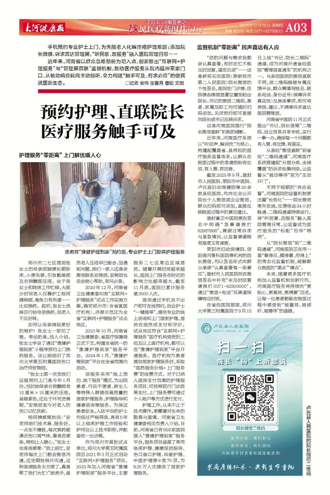 近年來,河南省以群眾急難愁盼為切入點(diǎn),創(chuàng)新推出“互聯(lián)網(wǎng)+護(hù)理服務(wù)”與“管理層直聯(lián)”監(jiān)督機(jī)制,推動醫(yī)療服務(wù)從院內(nèi)延伸至家門口、從被動響應(yīng)轉(zhuǎn)向主動傾聽,全力構(gòu)建“觸手可及、有求必應(yīng)”的便民就醫(yī)新生態(tài)。