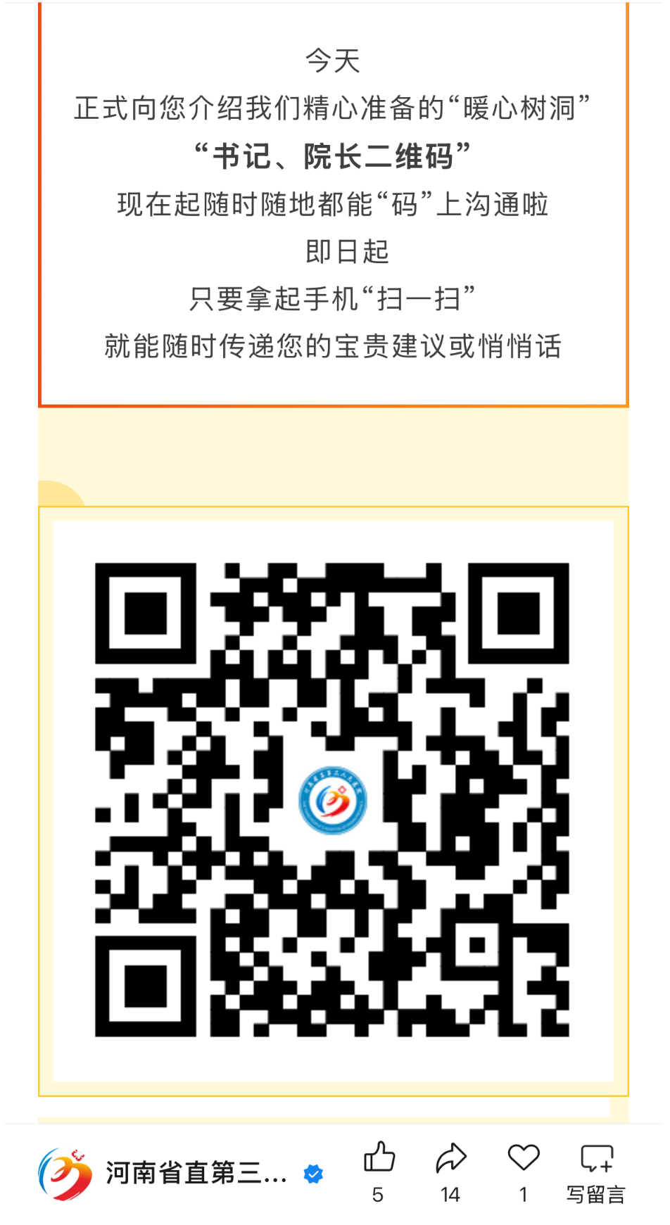 河南省中醫(yī)院11月正式推出“書記、院長信箱”二維碼,設(shè)立信息共享專班,實(shí)行一事一辦,確保每一個(gè)問題都有人管、有反饋、有落實(shí)。
