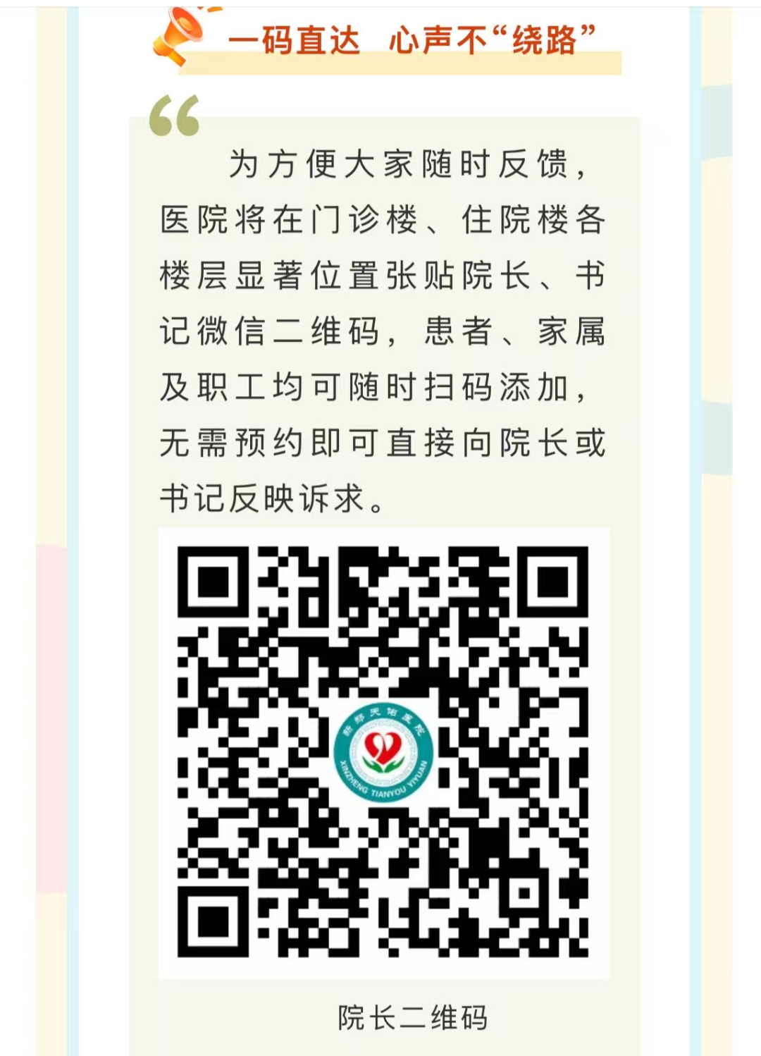 這是新鄭天佑醫(yī)院(原新鄭市第二人民醫(yī)院)院長微信的個(gè)性簽名,醫(yī)院在門診樓、住院樓各樓層顯著位置張貼出院長、書記的微信二維碼,患者、家屬及職工均可隨時(shí)掃碼添加,無須預(yù)約即可直接向院長或書記反映訴求。