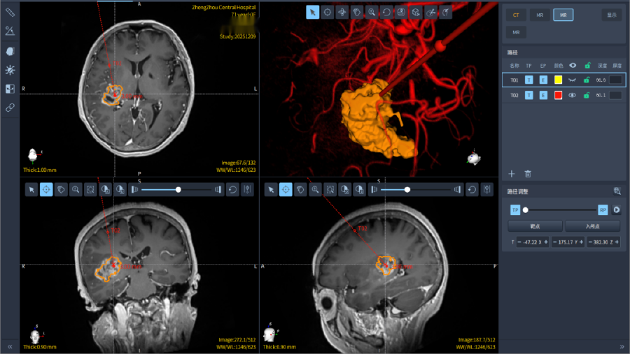 術(shù)前,醫(yī)療團隊依托患者 CT、磁共振影像數(shù)據(jù),通過計算機系統(tǒng)完成三維手術(shù)規(guī)劃,精準(zhǔn)設(shè)計穿刺路徑,避開顱內(nèi)大血管及重要神經(jīng)組織,確保手術(shù)安全。