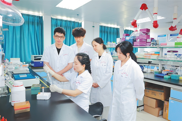 海南醫科大學培養的第一位長江學者馬燕琳(中)正帶領學生做試驗。
