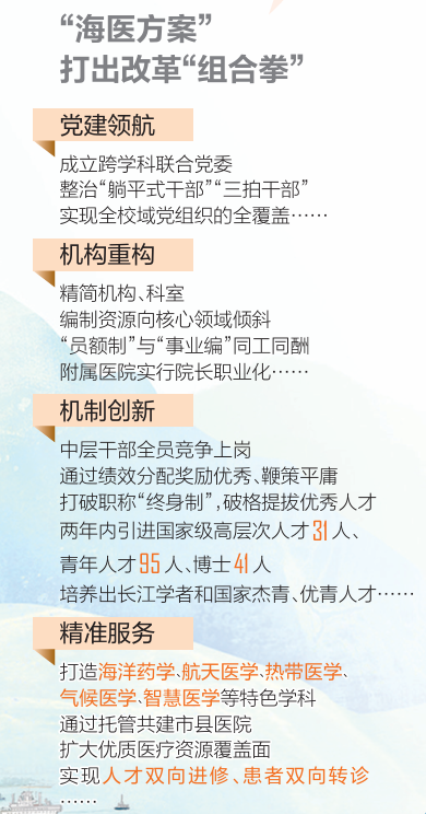 “海醫改革之所以能夠順利推進并取得階段性成效,在于堅持黨中央確定的事業單位改革方向,以猛藥去疴、重典治亂的決心,以刮骨療毒、壯士斷腕的勇氣,解放思想、實事求是、改革創新、動真碰硬,以系統思維破解深層矛盾,以重點突破帶動整體推進,始終堅持教育科技醫療人才一體化改革,保持改革耐心和定力。”該校黨委書記張彩虹教授在總結改革經驗時這樣強調。