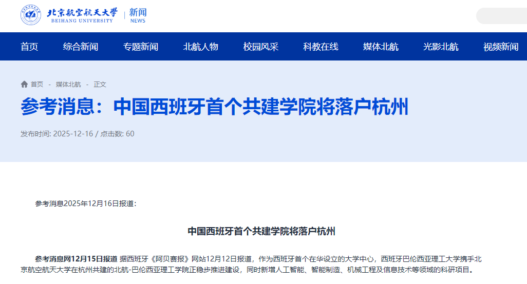 據(jù)北京航空航天大學(xué)新聞網(wǎng)12月16日消息,作為西班牙首個(gè)在華設(shè)立的大學(xué)中心,西班牙巴倫西亞理工大學(xué)(簡(jiǎn)稱(chēng)“UPV”)攜手北京航空航天大學(xué)在杭州共建的北航-巴倫西亞理工學(xué)院正穩(wěn)步推進(jìn)建設(shè),同時(shí)新增人工智能、智能制造、機(jī)械工程及信息技術(shù)等領(lǐng)域的科研項(xiàng)目。巴倫西亞理工大學(xué)成為首個(gè)在中國(guó)設(shè)立校區(qū)的西班牙高校。