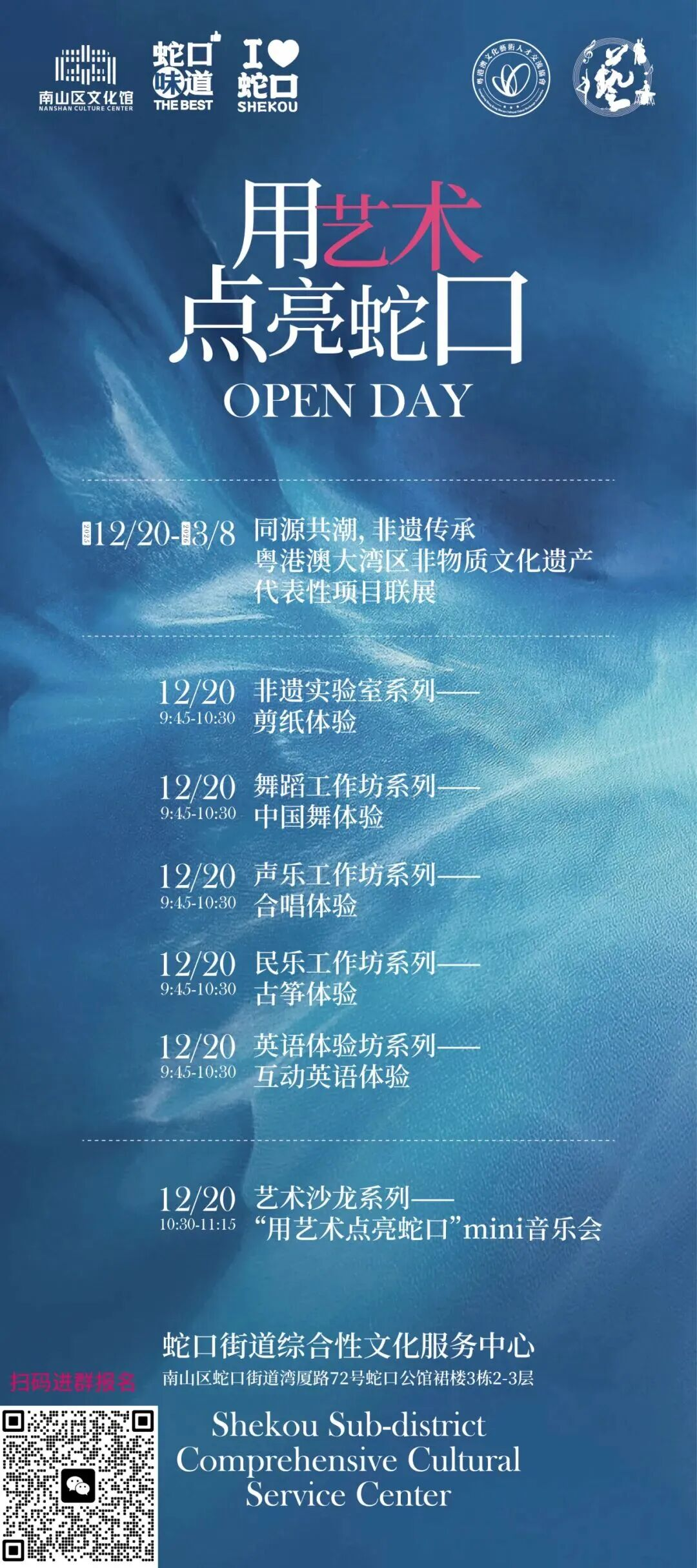 中心由粵港澳文化藝術(shù)人才交流協(xié)會(huì)管理運(yùn)營(yíng),并掛牌設(shè)立“粵港澳文化藝術(shù)人才交流協(xié)會(huì)交流實(shí)踐中心(蛇口)”,將持續(xù)開展文藝隊(duì)伍培育、非遺實(shí)驗(yàn)室、深港名師講堂、趣味藝術(shù)課程及主題展覽等品牌活動(dòng),助力市民以灣區(qū)視野理解文化,以文化深度融入灣區(qū)生活。