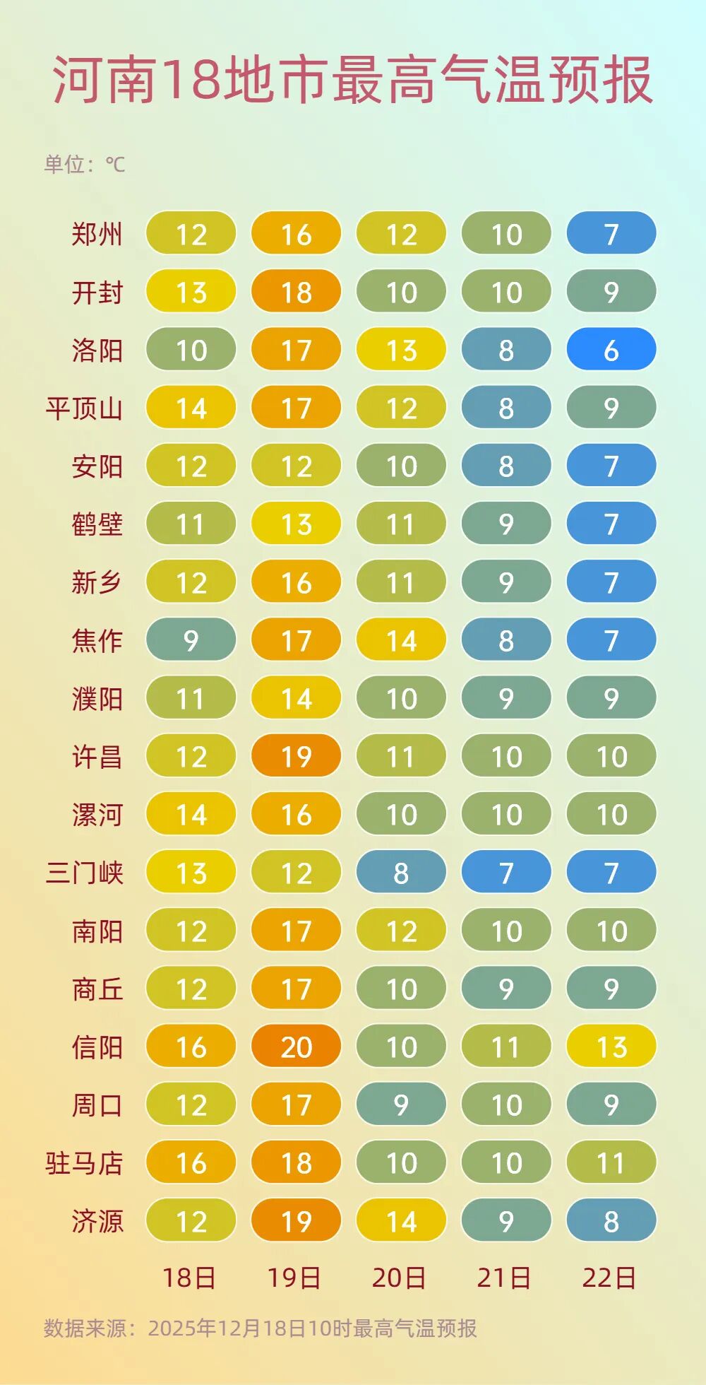 降溫:受降水和冷空氣的共同影響,預計20-21號全省氣溫明顯下降。比如鄭州,明天最高氣溫16℃,下周一逐漸降至7℃,累積降溫幅度均可達9℃;信陽則會從明天的20℃驟降至周六的10℃,一天的降溫幅度達10℃。