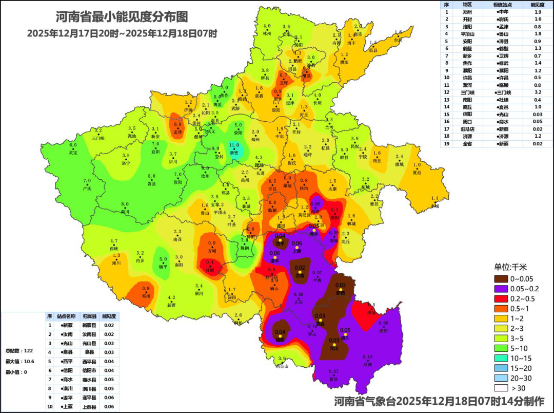 昨天夜里到今天早晨(12月17日20時至18日7時),中東部、南部部分縣市區出現了濃霧天氣,其中周口、駐馬店、信陽出現強濃霧(能見度<200米),局地特強濃霧(能見度<50米)。今天上午,東部、南部地區大霧天氣逐漸消散。預計今天夜里到明天上午,北中部、西南部局地有霧,駕車注意保持車距、謹慎慢行!