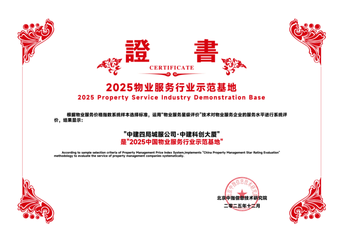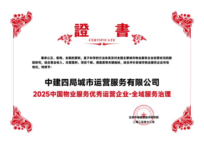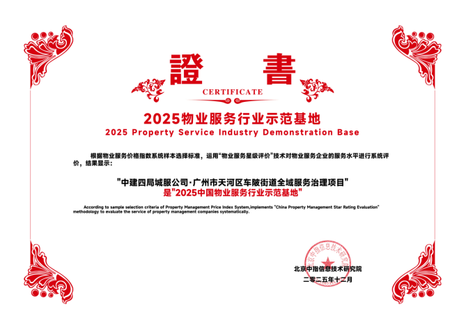 在本次研究中,中建四局城服公司獲多項(xiàng)榮譽(yù),其中包括被評(píng)選為“2025粵港澳大灣區(qū)物業(yè)服務(wù)市場(chǎng)地位領(lǐng)先企業(yè)”“2025中國(guó)物業(yè)服務(wù)優(yōu)秀運(yùn)營(yíng)企業(yè)——全域服務(wù)治理”。此外,其服務(wù)的三個(gè)重點(diǎn)項(xiàng)目中建科創(chuàng)大廈、中建天河精誠(chéng)壹號(hào)(閱山湖園)、廣州市天河區(qū)車陂街道全域服務(wù)治理項(xiàng)目,被評(píng)為“2025中國(guó)物業(yè)服務(wù)行業(yè)示范基地”,這些項(xiàng)目覆蓋住宅、寫字樓及城市服務(wù)等多種類型,全面展現(xiàn)了中建四局城服公司在多元業(yè)態(tài)下的卓越管理能力。
