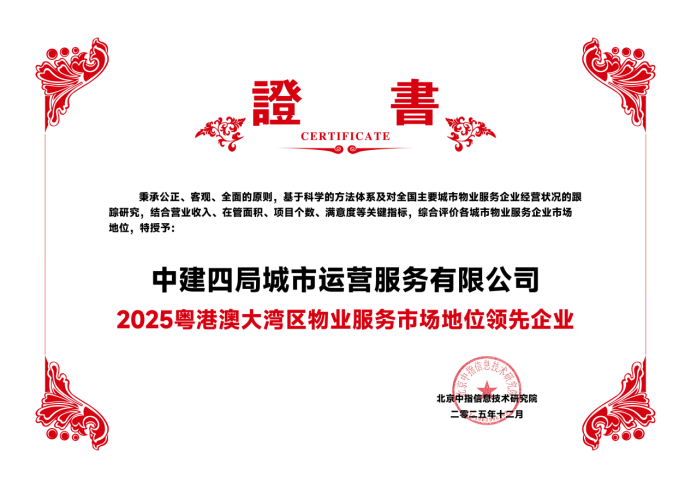 粵港澳大灣區(qū)作為中國(guó)經(jīng)濟(jì)最活躍、城市化程度最高的區(qū)域之一,物業(yè)管理市場(chǎng)競(jìng)爭(zhēng)激烈。近年來(lái),中建四局城服公司通過(guò)深耕粵港澳大灣區(qū),積極探索城市治理體系和治理能力現(xiàn)代化建設(shè),不斷提升市場(chǎng)影響力和競(jìng)爭(zhēng)力。憑借黨建引領(lǐng)、戰(zhàn)略深耕和品牌建設(shè)等舉措,公司成功實(shí)現(xiàn)了在大灣區(qū)的突破轉(zhuǎn)型,贏得了政府和市場(chǎng)的雙重認(rèn)可。再次榮獲“2025粵港澳大灣區(qū)物業(yè)服務(wù)市場(chǎng)地位領(lǐng)先企業(yè)”的榮譽(yù),是對(duì)其在大灣區(qū)市場(chǎng)綜合實(shí)力和服務(wù)水平的高度肯定,也為其進(jìn)一步拓展大灣區(qū)業(yè)務(wù)奠定了堅(jiān)實(shí)基礎(chǔ)。