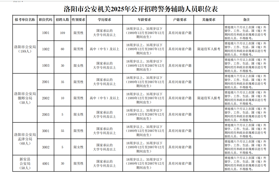 1.洛陽市公安機關2025年公開招聘警務輔助人員職位表