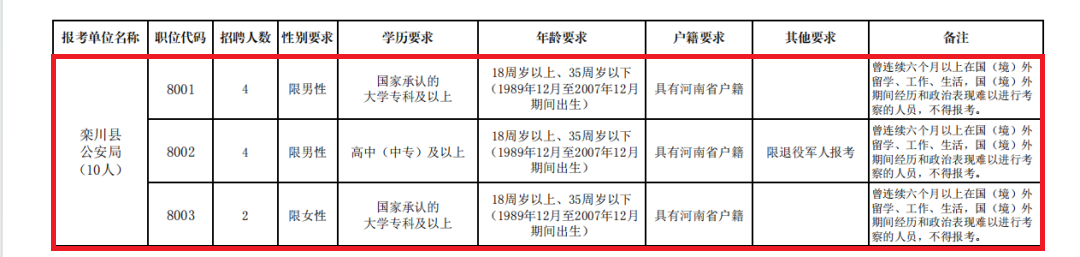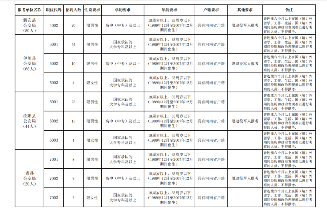 洛陽市公安機關計劃招聘輔警共501名,其中,洛陽市公安局199名、洛陽市公安局偃師分局50名、洛陽市公安局孟津分局60名、新安縣公安局50名、伊川縣公安局68名、汝陽縣公安局44名、嵩縣公安局20名、欒川縣公安局10名。招聘職位及有關要求詳見附件1。