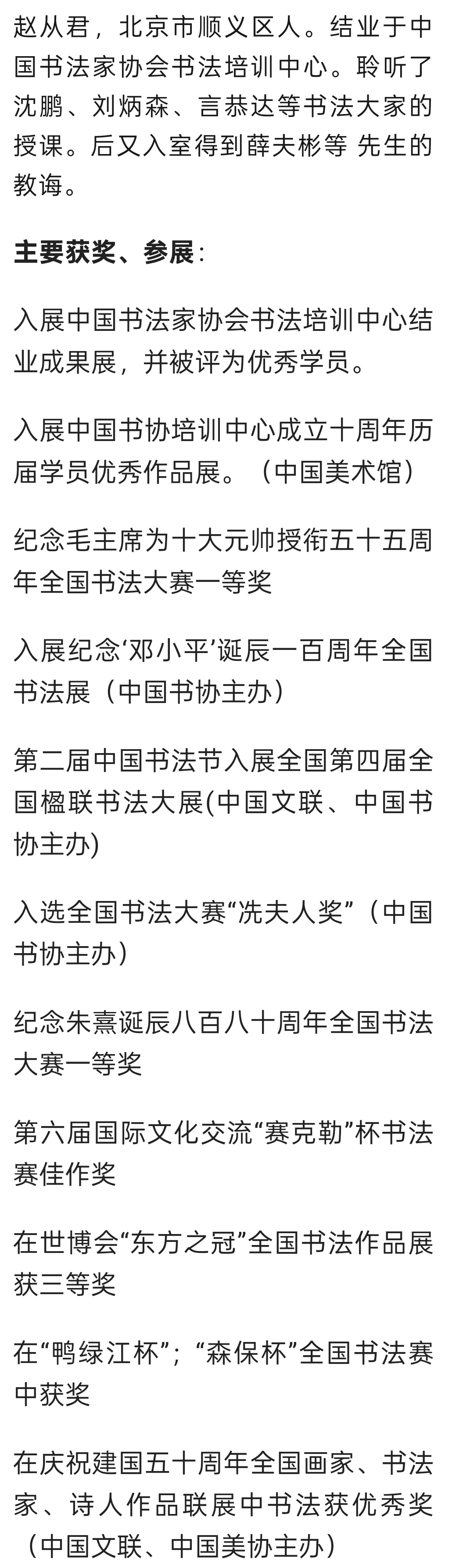 “冗繁削盡留清瘦,畫到生時是熟時。”這是清代著名書畫藝術家鄭板橋的名句。反映了一代書畫大師永不滿足、不懈攀登藝術巔峰的精神。誠然,想在藝術上有所成就,心誠意篤、甘于寂寞、推陳出新不可或缺,如此方能于千錘百煉中形成自己的特色與風格,創造出富有時代氣息和生命力的作品。趙從君先生的書法作品,便是在不斷創新中凝聚出靈氣與美感的。