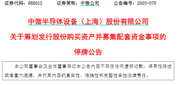 【大河財立方消息】12月18日,中微半導體設備(上海)股份有限公司(證券簡稱:中微公司)發布公告稱,正籌劃通過發行股份方式購買杭州眾硅電子科技有限公司(以下簡稱杭州眾硅)控股權并募集配套資金,公司股票將自12月19日開市起開始停牌,預計停牌時間不超過10個交易日。