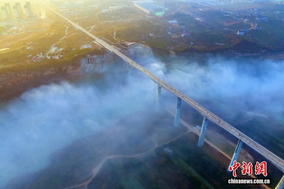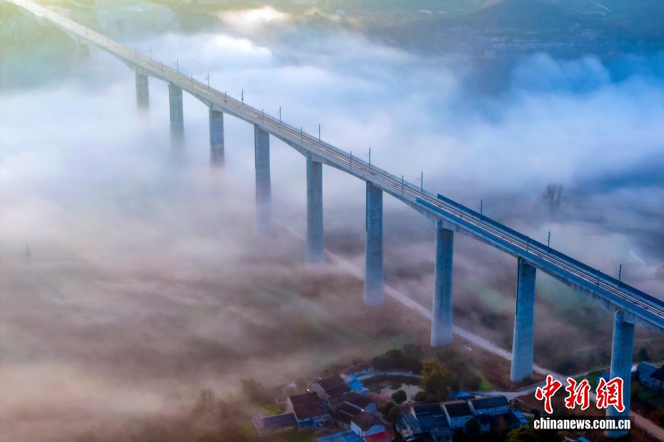 受河谷濕地冷暖氣流交匯影響,黃柏河生態濕地連日來出現平流霧景觀,宛如仙境。黃柏河位于湖北省宜昌市,是長江一級支流,也是三峽庫區生態屏障,以前由于礦山堆場沿河布設,水質一度惡化。近年來,當地統籌推進黃柏河水生態和水環境綜合治理,打造人與自然和諧共處的濕地生態體驗區,讓黃柏河重現碧波蕩漾的美景。圖為黃柏河特大橋宛如巨龍穿梭云端。